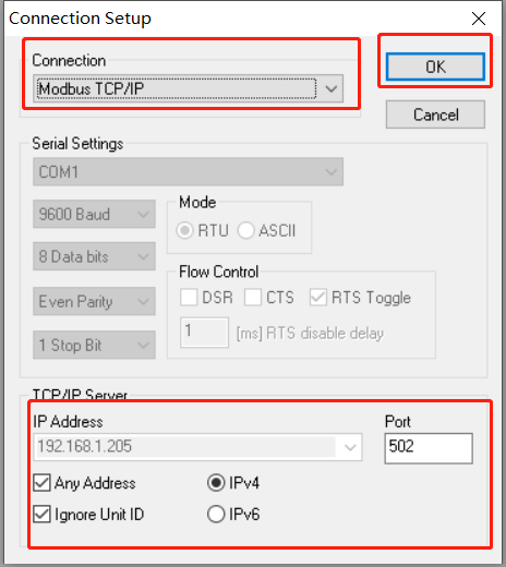 打开 modbus slave 调试助手,点击 connection--connect,如下图设置后点击ok