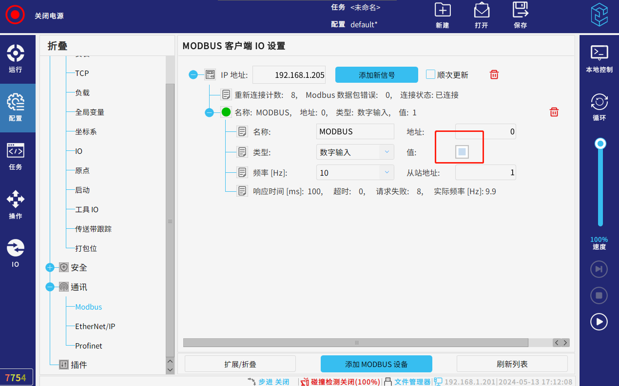 点击示教器页面,输入类型-数字输入 地址为0从站地址可为1,频率10(可选),当图标变为绿色即ok