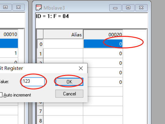 可在modbus slave界面,点击对应地址输入数值,