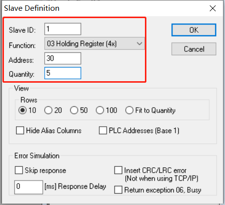 选择id 1,function03,地址30,数量5(自定义),点击ok