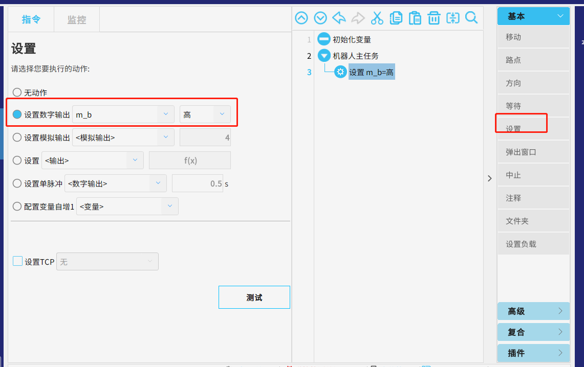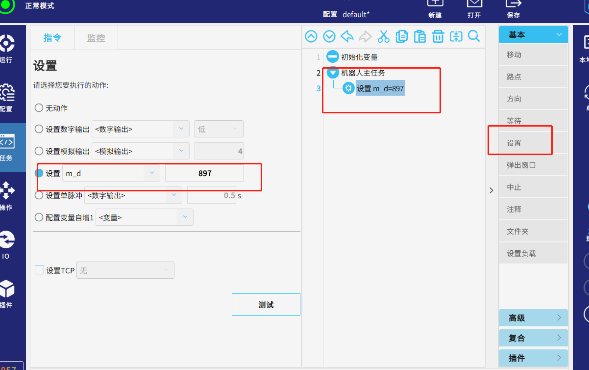 机器人中如上图设置,点击运行,调试助手中显示为1,即成功
