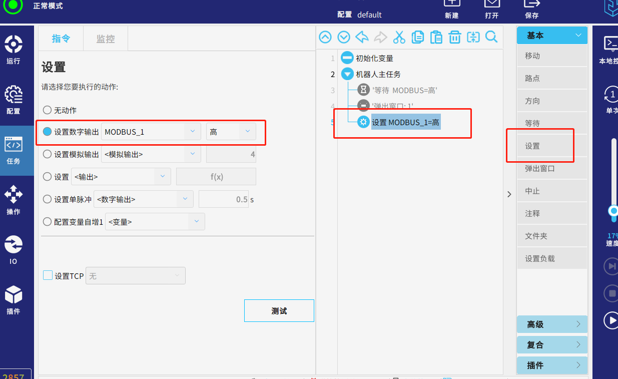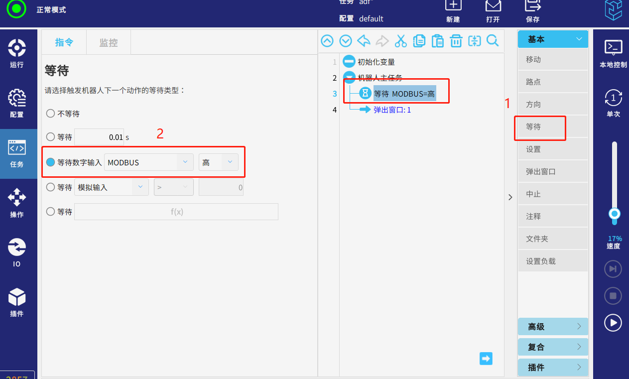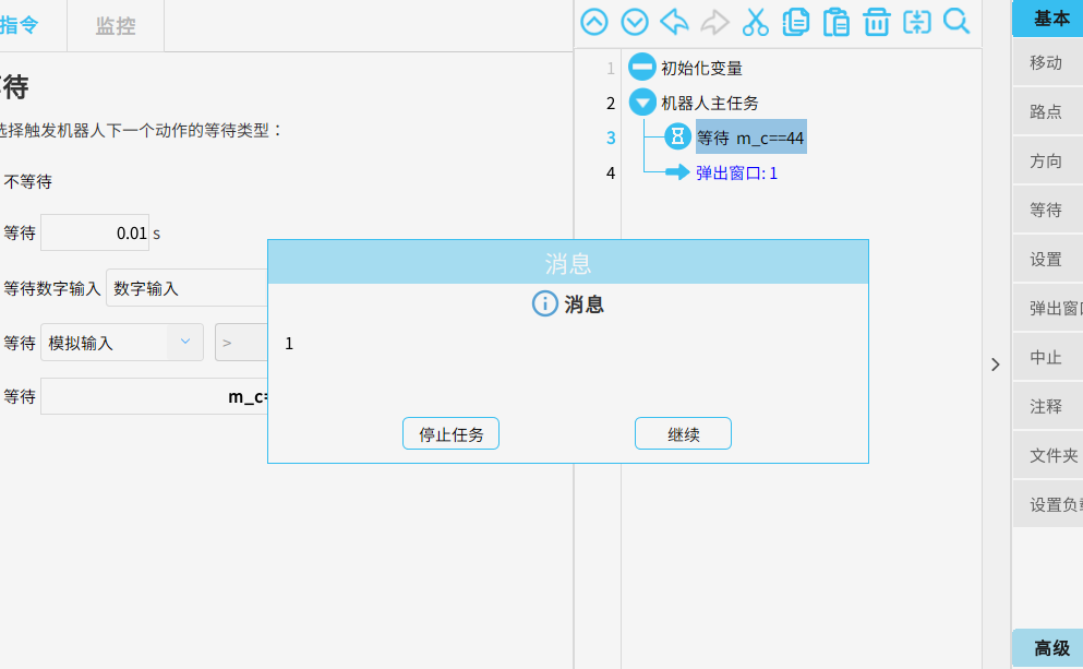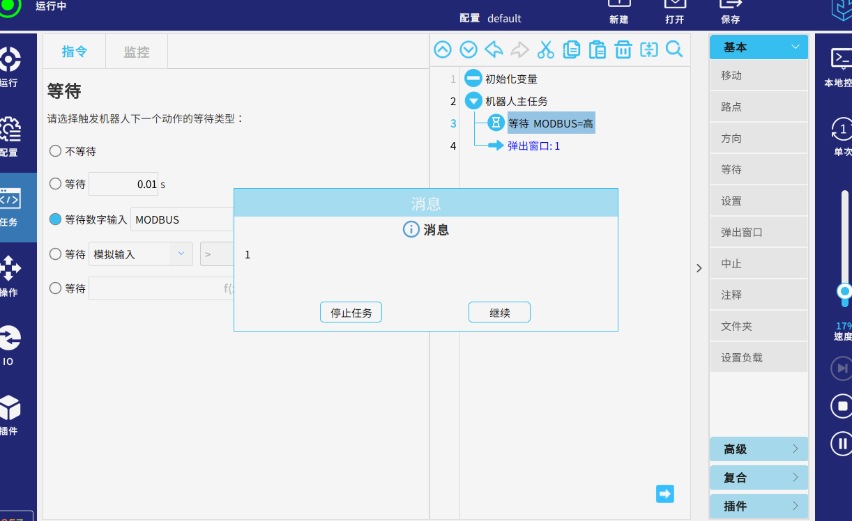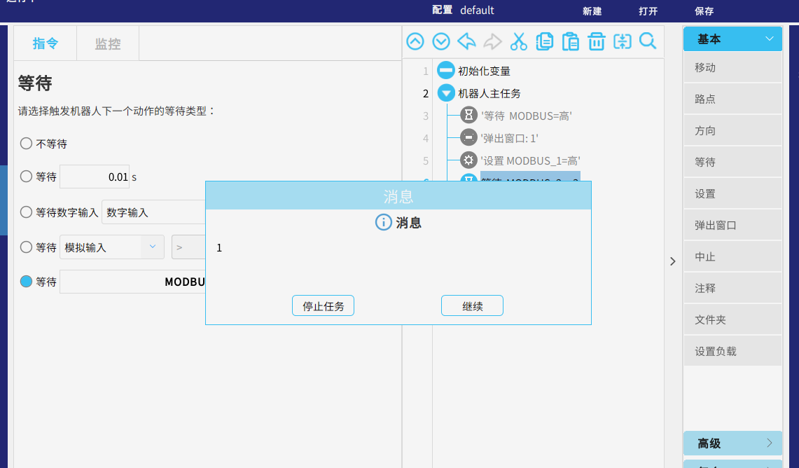 运行任务,当从站的信号modbus=高 时 ,页面弹出窗口提示“1”,代表已获取到该mosbus