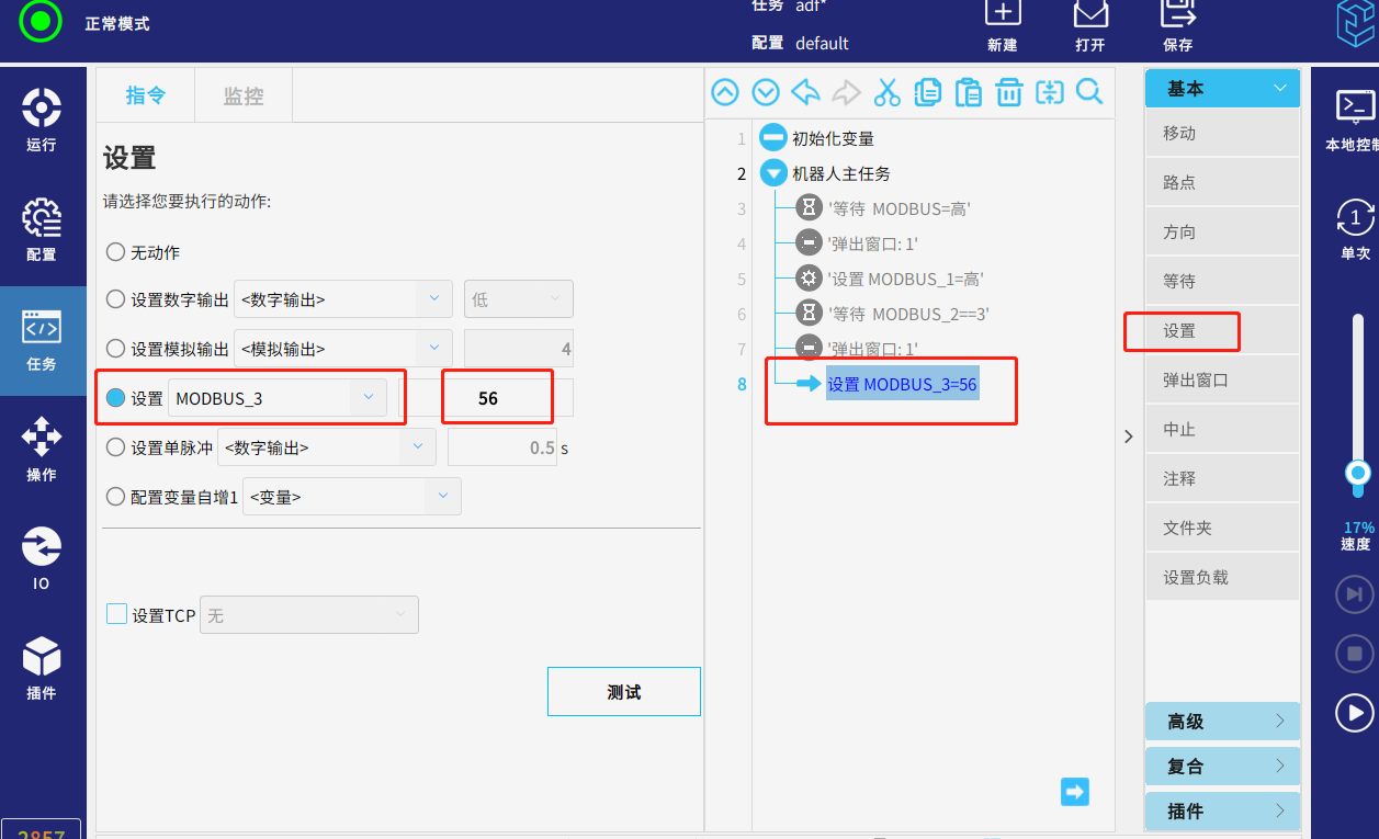 为方便在modbus信号在程序中方便配置和使用,可以在配置--通讯--modbus连接机器人自己作为主站