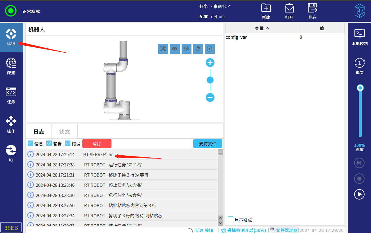 2.10 在机器人运行脚本,通讯成功后,通讯助手就能收到机器人发送的字符串