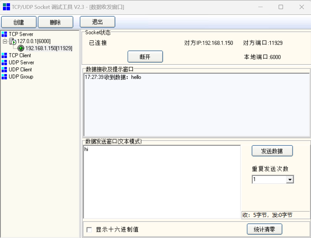 ret = socket_open("192.168.1.150",6000) 与通讯助手建立连接,ip地址填所连接设备的ip