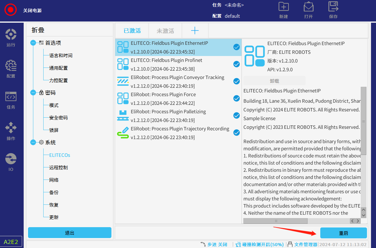 5. 点击重启,再重新打开一遍机器人插件。重新打开后,插件生效。