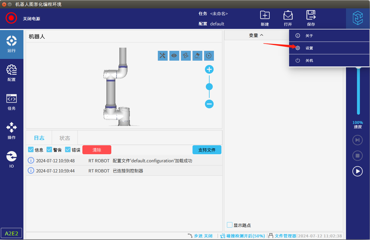 2. 打开机器人软件后,点击右上角G22恒峰log点击设置。
