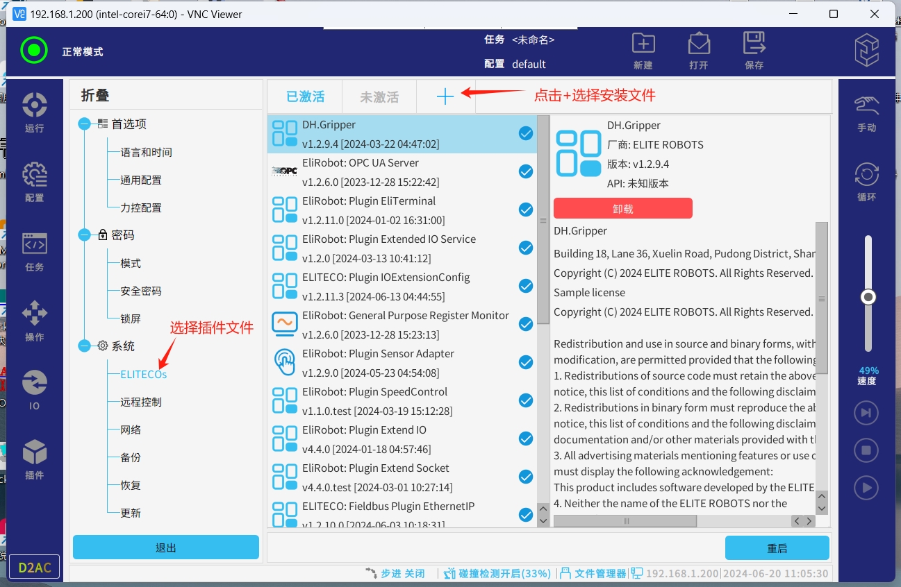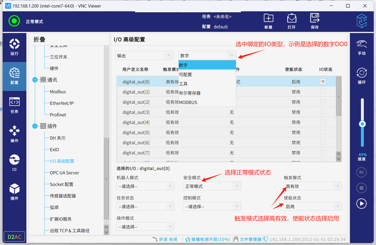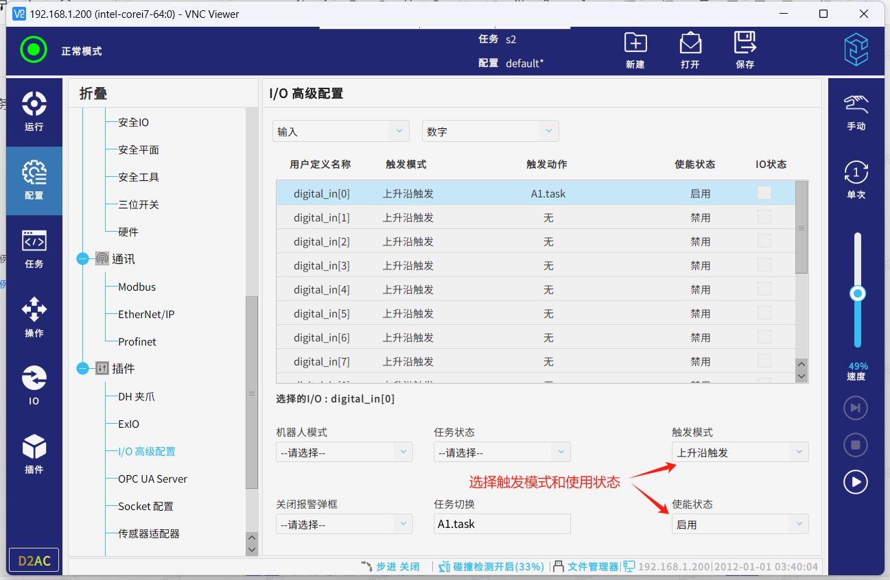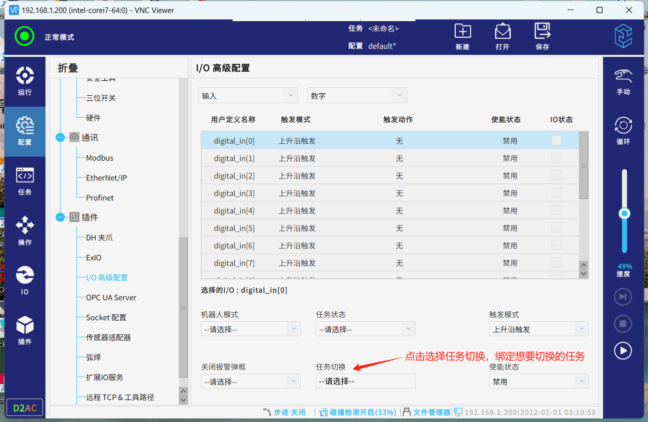安装成功后进入配置,插件,IO高级配置,就可配置对应的IO来触发对应的功能或者绑定对应的IO来接收机器人的状态变化。