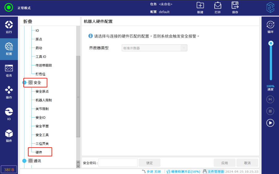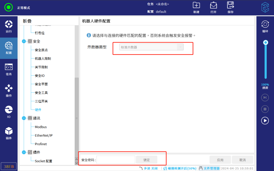 2.7. 在下方输入安全密码后,选择示教器类型。(新机器人需要在设置中,先设置安全密码。没设置安全密码,点击密码框,会提示请在系统设置中设置安全密码。如果没有该提醒,可以直接输入密码,请询问现场人员,设置的安全密码)