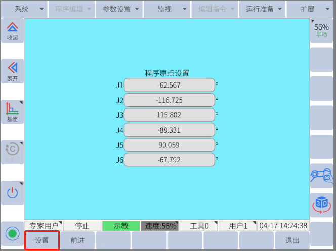 2. 将机器人移动到所需的程序起始位置。导航到运行准备 -> 零点设置 -> 程序原点,按“设置”按钮,将机器人当前位置设置为程序原点