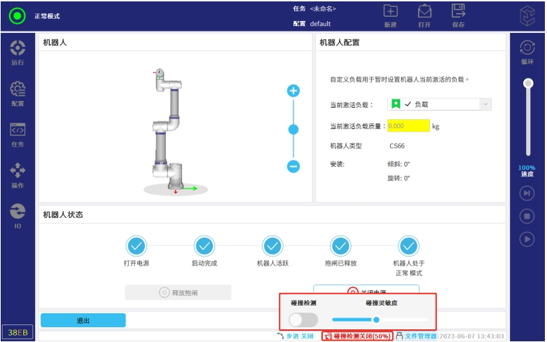 值得注意的是,如果使用方法三设置碰撞灵敏度,该值只会在开发者模式里面显示,不会在示教器界面下方的碰撞检测实时刷新(重新点击碰撞灵敏度界面,再关闭,才会刷新)。