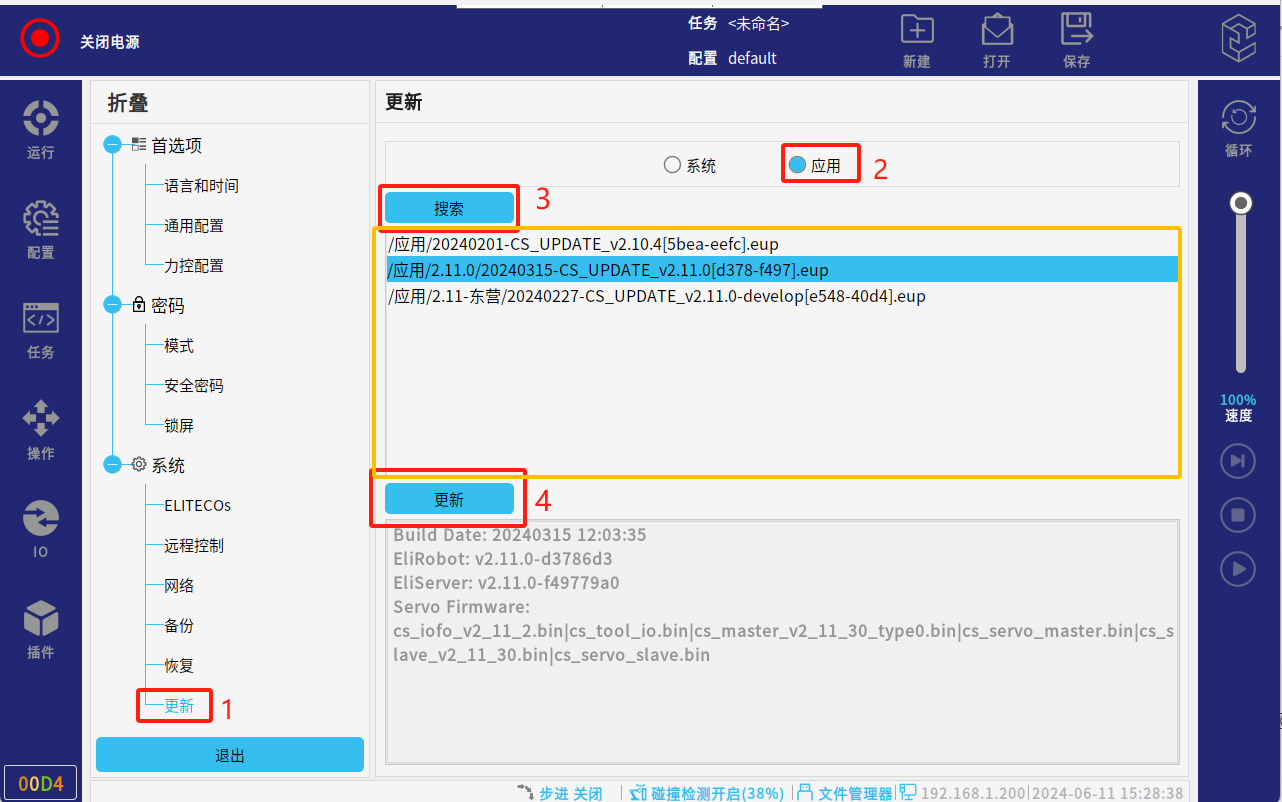 调试阶段建议全部勾选进行升级,也可单独勾选应用升级(应用:系统版本,一般是解决应用软件的bug和界面优化;MCU: 指伺服升级;驱动IO:指末端IO的升级)。点击“是”,会自动进行更新系统;请勿操作机器人或将其断电。等待更新后重启。