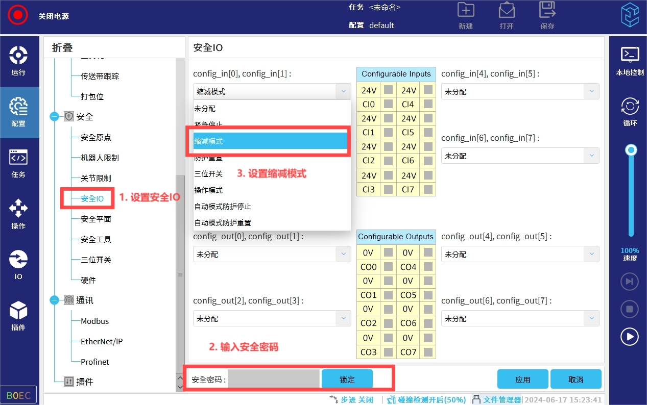 缩减模式的应用场景二是在安全IO功能配置界面的安全输入/输出选项中,可以选择配置缩减模式信号,以实现不同的功能。