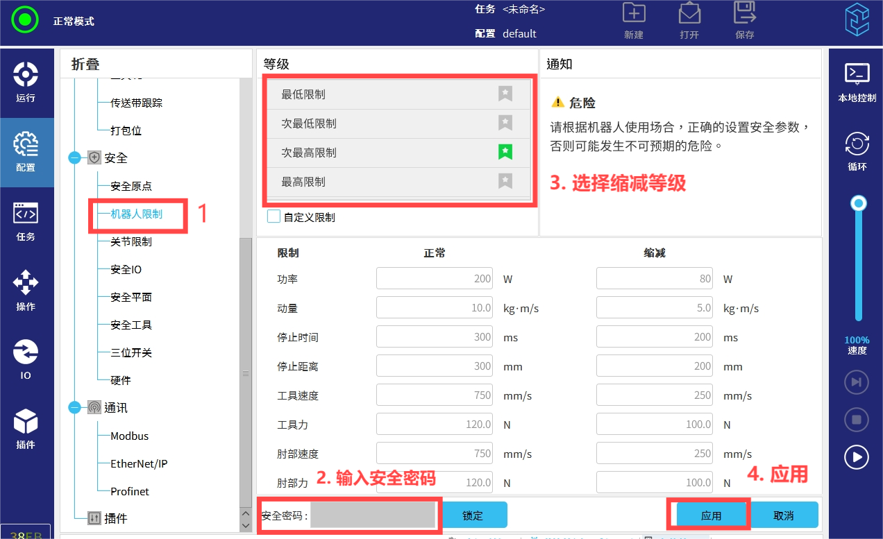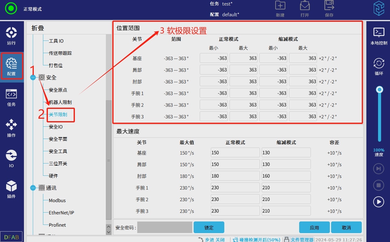 注意:在设置机器人限制参数时,正常模式下的数值要大于缩减模式下的数值。