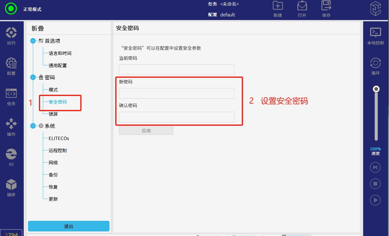 选择“设置> 密码> 安全密码”,通过设置安全密码来解锁安全配置相关参数。设置好安全密码后点击应用即可。