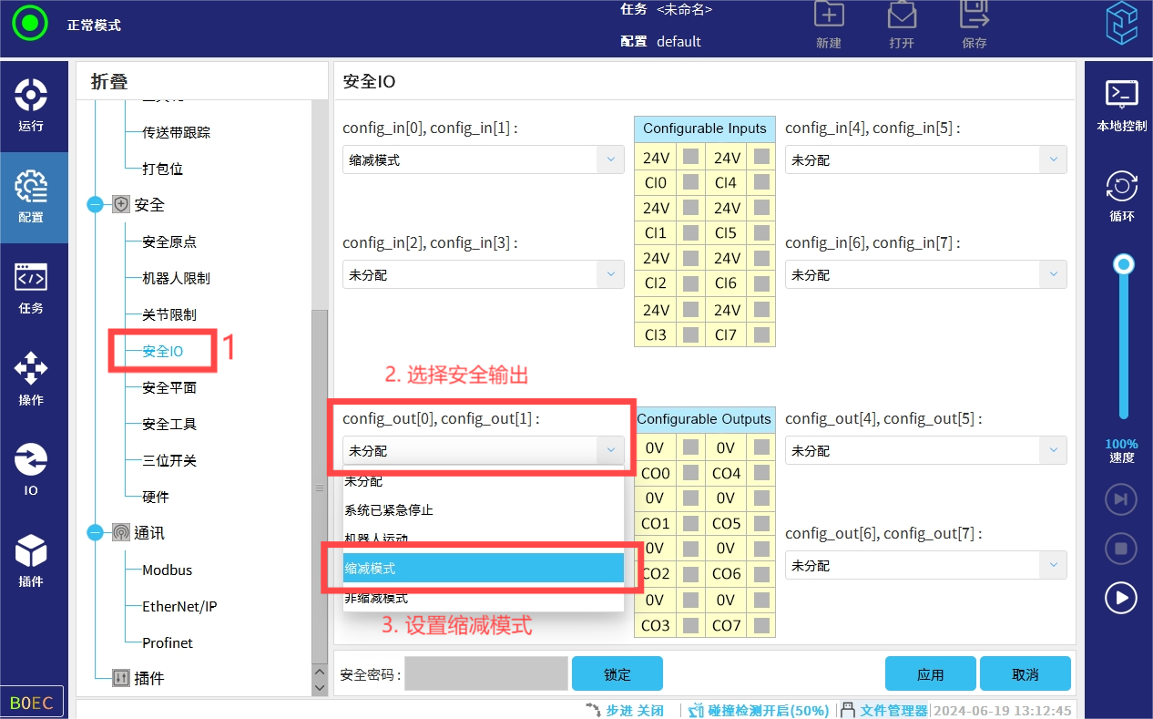 安全输出缩减模式配置,在<配置-----安全io-----安全输出config_out[0~7]-----缩减模式>。该功能的主要作用是当机器人本体处于缩减模式,或安全输入配置了“缩减模式”输入且当前信号为低电平时,将发送低电平信号;否则信号为高信号。
