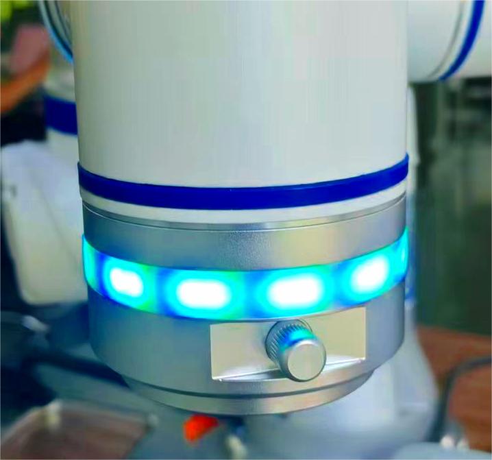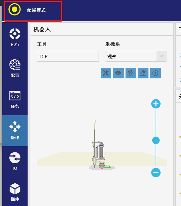 4. 如果机械臂进入缩减模式,右上角会变成黄色指示按钮,机械臂末端法兰指示灯会变为绿蓝交替灯状态。