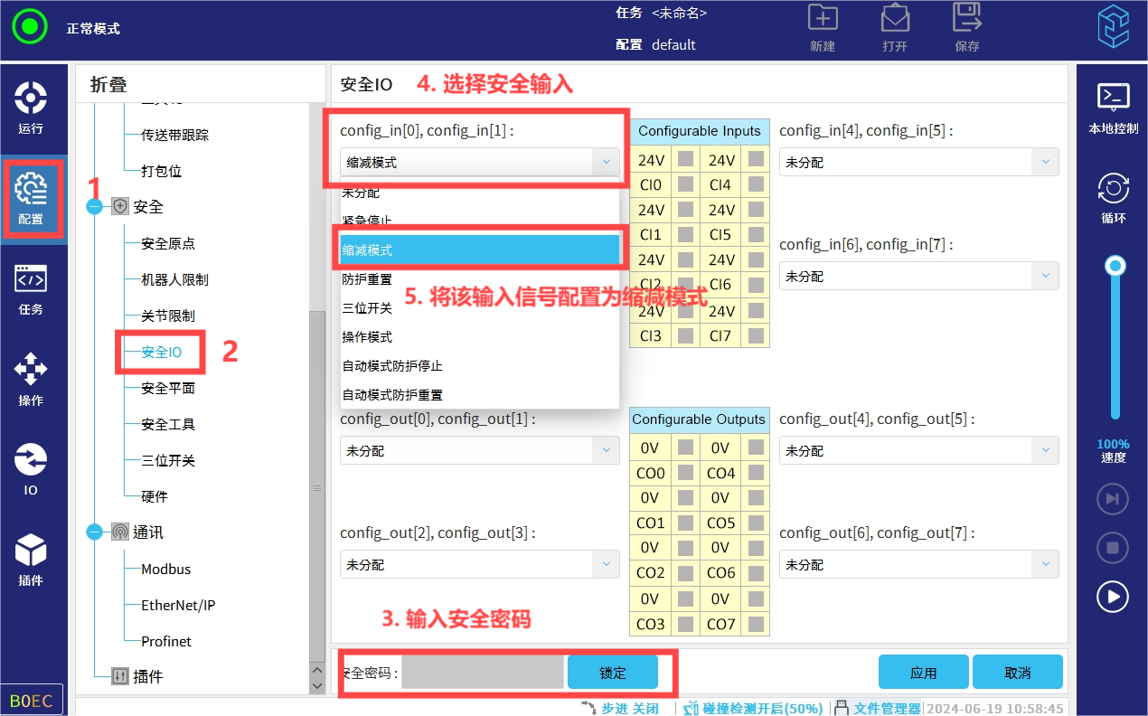 安全输入缩减功能配置,在<配置-----安全io-----安全输入config_in[0~7]-----缩减模式>。该功能的主要作用是外部控制安全输入信号来使机械臂进入缩减模式。选择输入信号为“缩减模式”,低电平有效。当输入信号都为低电平时,机器人为“缩减模式”;当输入信号为一高一低时,机器人会发出安全报警;而都为高电平,机器人为“正常”模式。