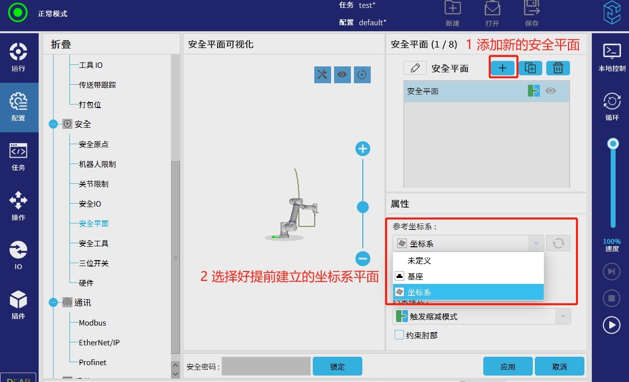 3. 添加新的安全平面,一共可以设置8个安全平面,选择坐标系。