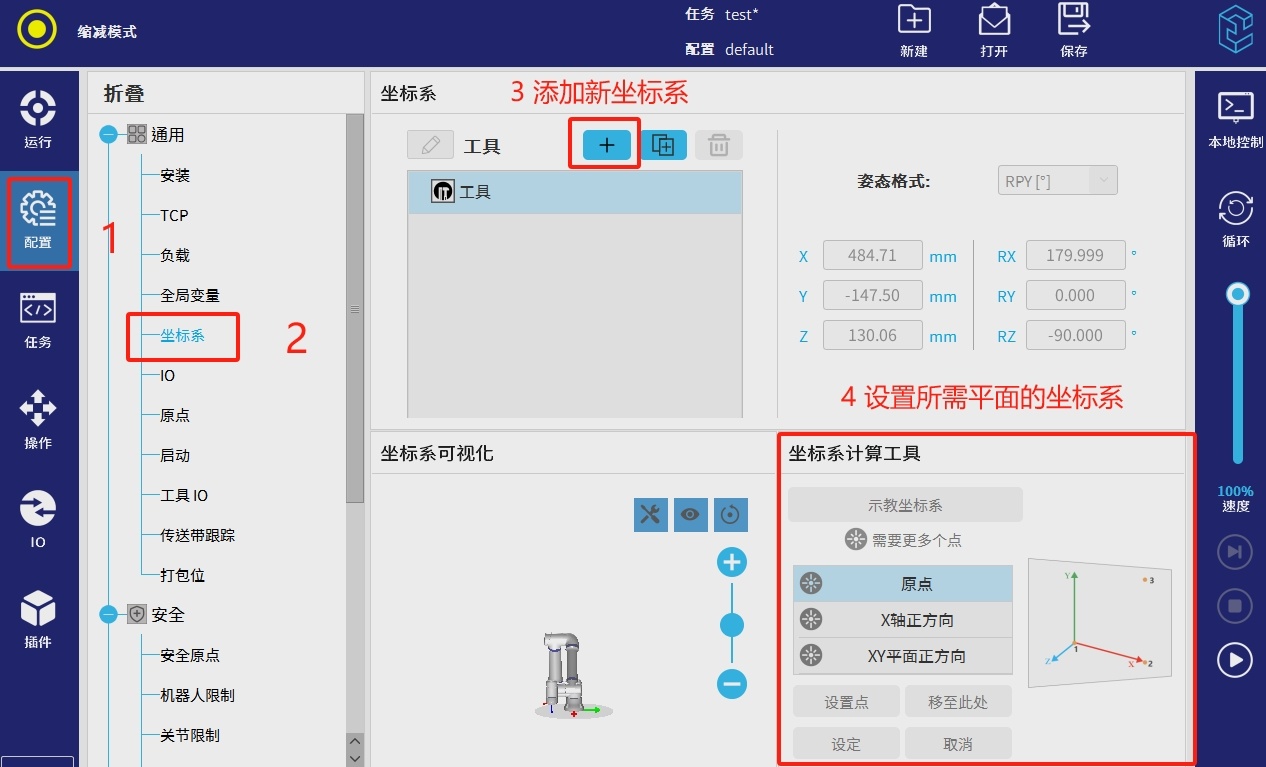 要设置安全平面需要先设置一个坐标系,因为安全平面是基于你设置的坐标系的X,Y平面的Z方向平移来确定具体位置的。用户坐标系的设置请参照用户手册上面设置。