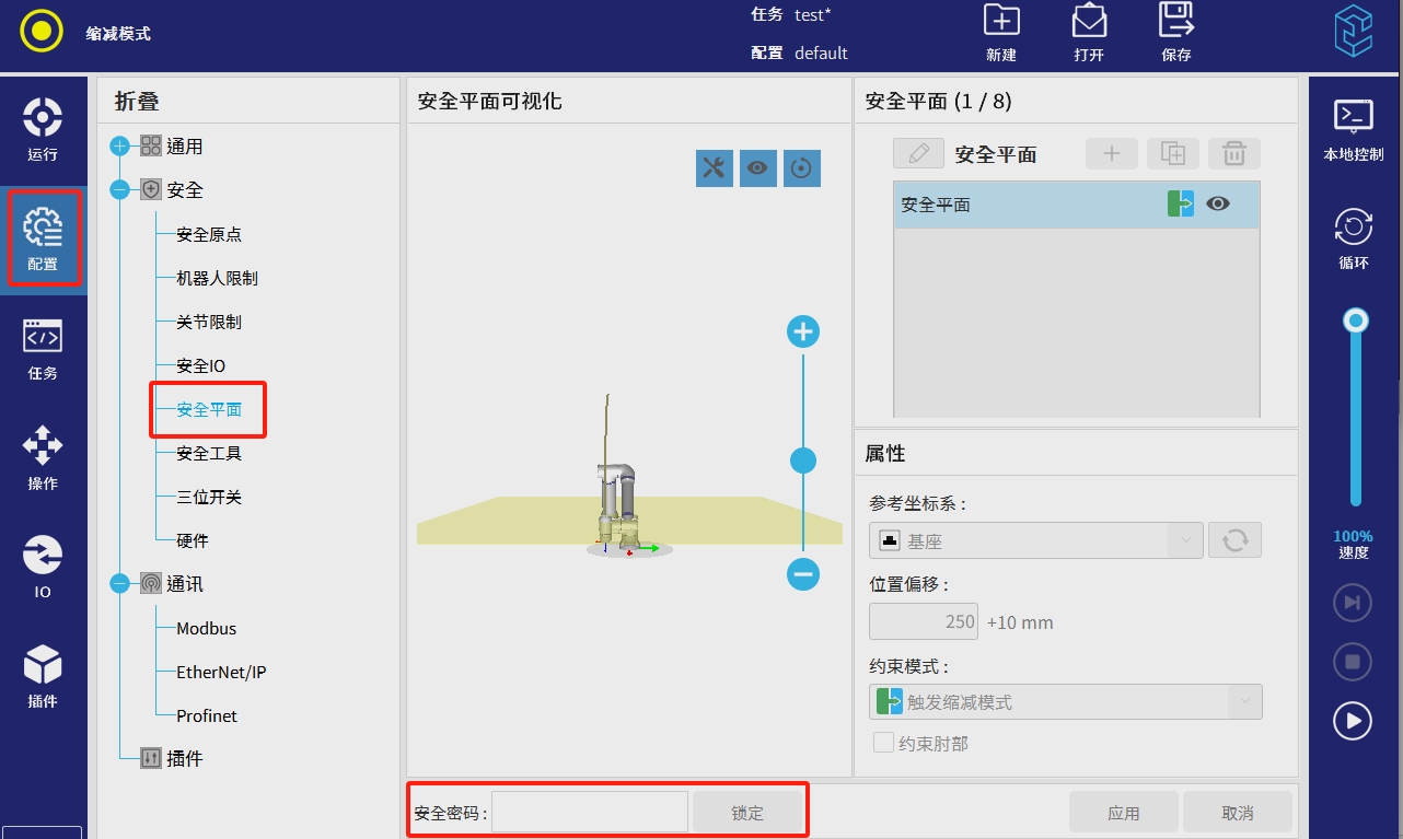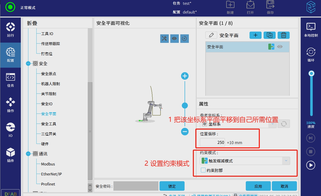注意:位置偏移后面的参数 “ +10mm ” 的意思是机械臂工具中心点靠近安全平面10mm处就开始触发所设置的模式了。