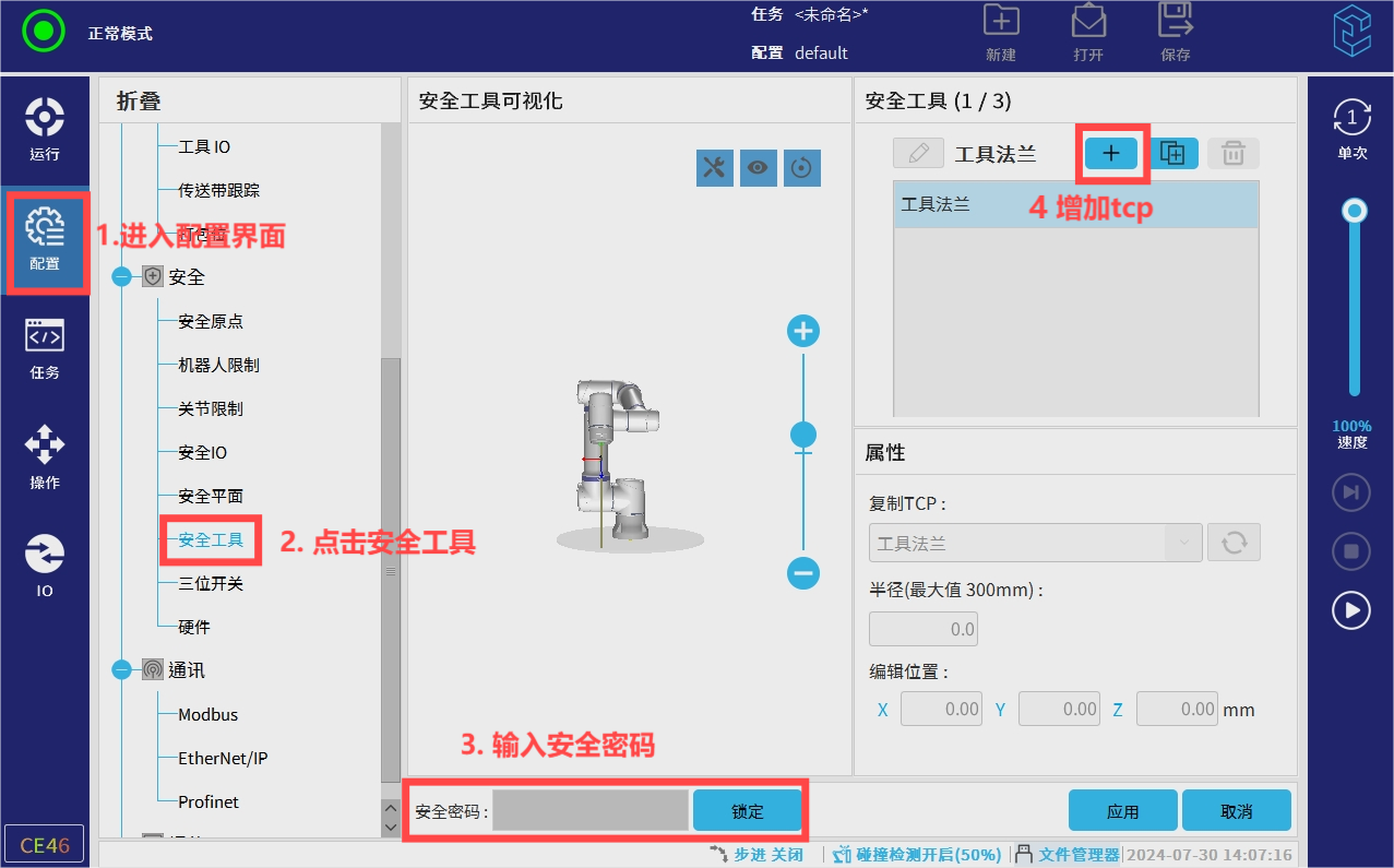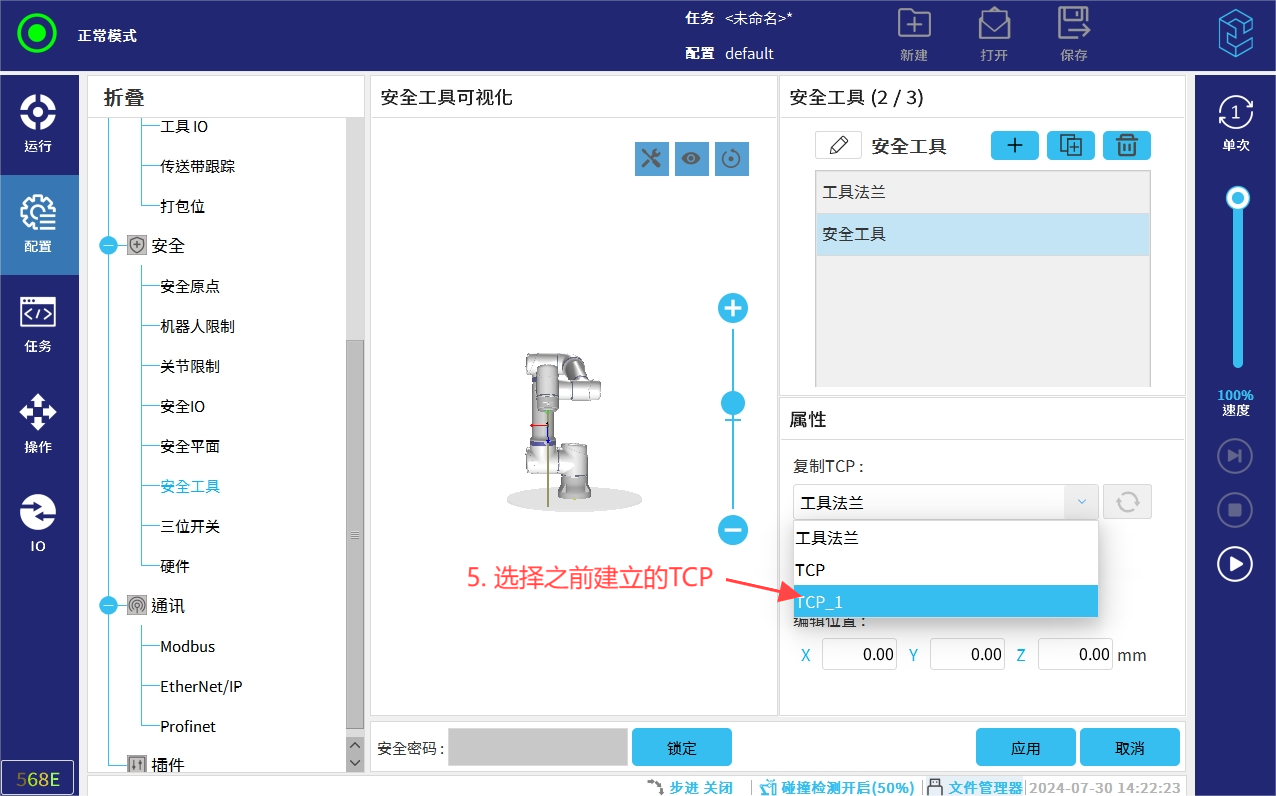 半径的距离是0-300mm之间。设置完成安全工具后一定要点击应用保存。点击应用的时候机械臂会下电,是正常的。
