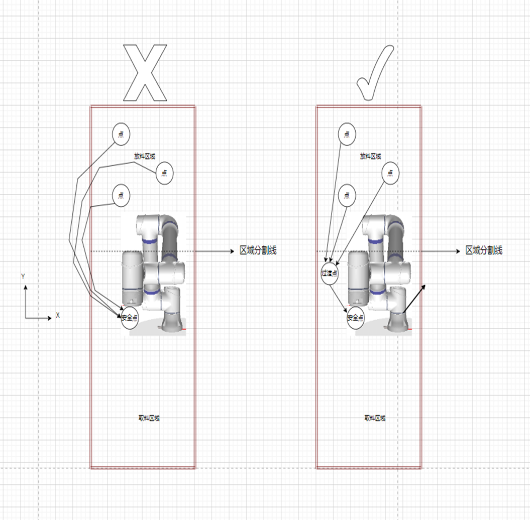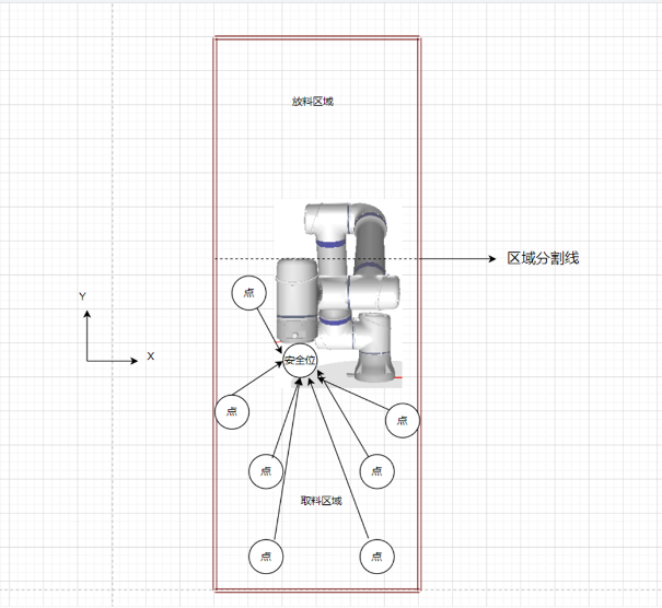 1.由下图案例可将工作区域分为取料取料和放料区域,取料区域由图2-1可见在任意一点都可以回安全点,那么G22恒峰就可以直接判断是否在取料区域上升到安全高度直接回安全点即可。